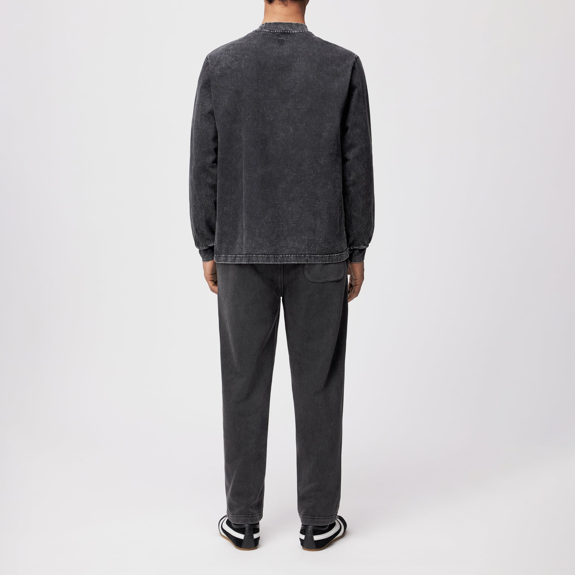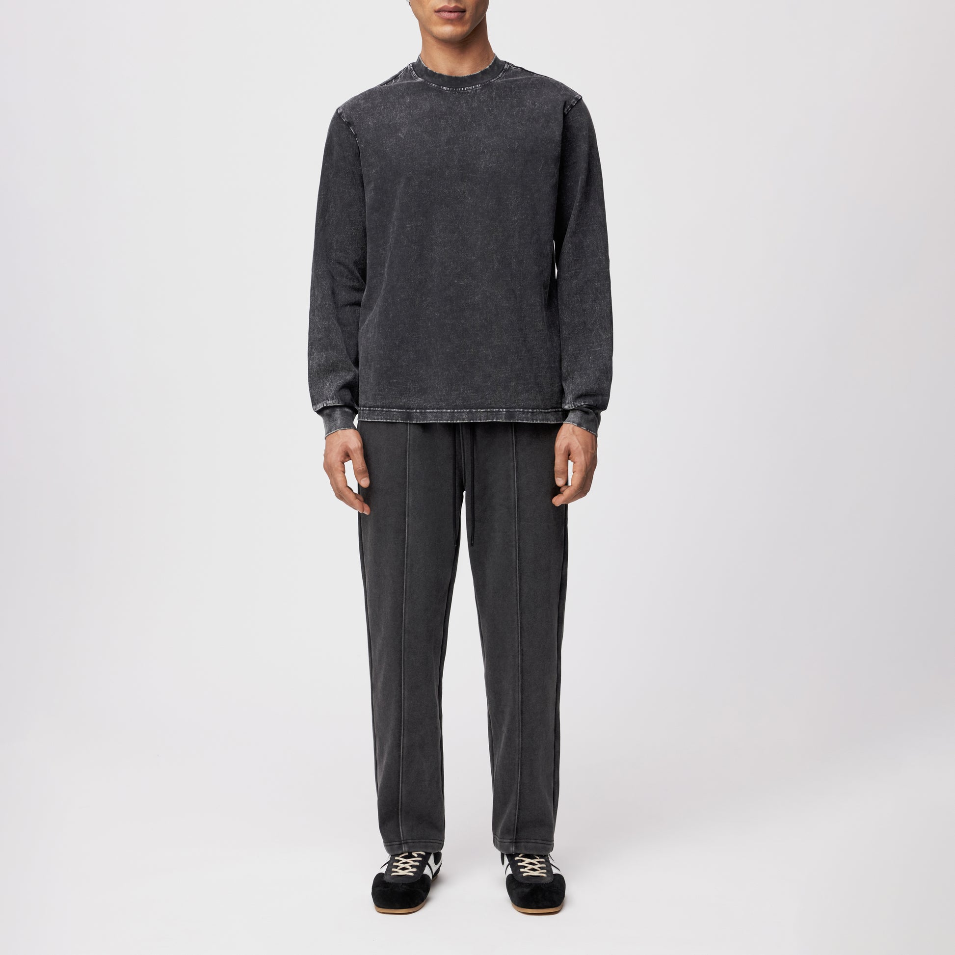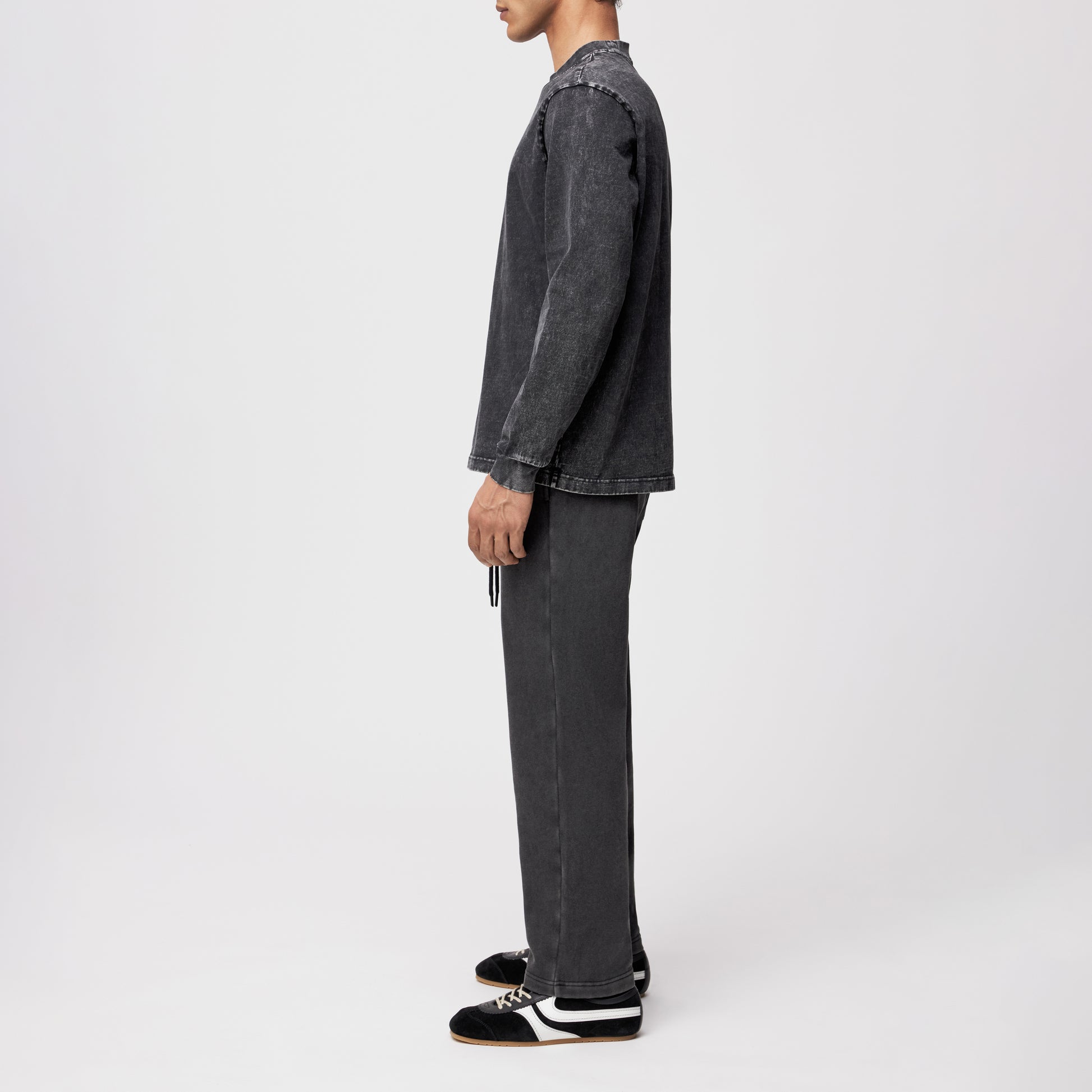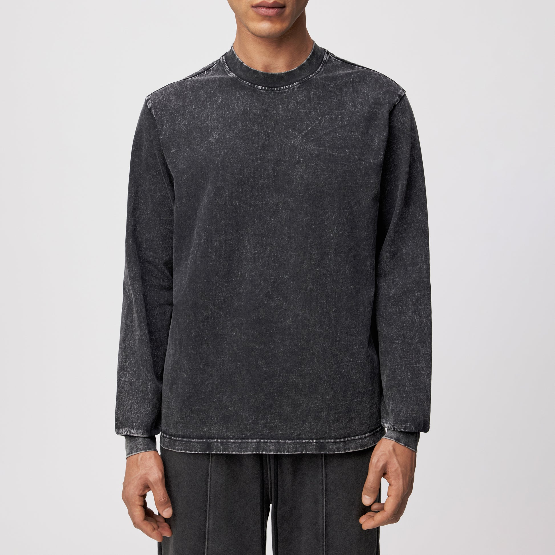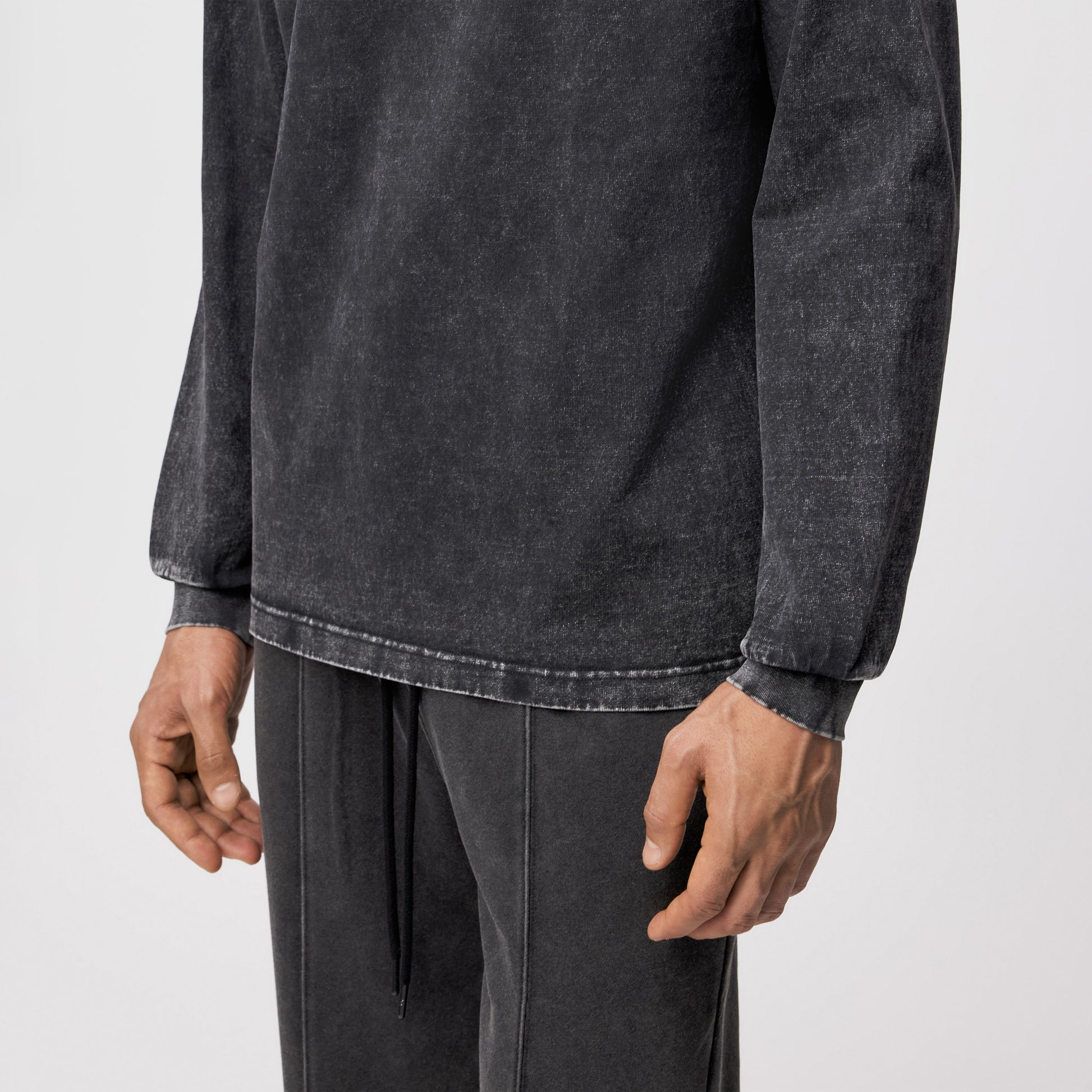 חולצה בגזרה ישרה עם שרוולים ארוכים, כתפיים שמוטות וצווארון ריב גבוה. עשויה מכותנה איכותית שעברה שטיפה מיוחדת, היוצרת טקסטורה ייחודית עם מראה אבן (stone-washed) וגוון מעט דהוי